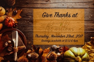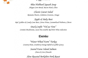 Enjoy Thanksgiving Day dinner featuring turkey from Water Wheel Farm. For more details, please click here. $49 per adult and $19.95 per child under 12.