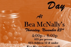 Bea McNally's is offering a fixed price, four-course Thanksgiving dinner, featuring turkey or ham and all the trimmings. Click here for more details. $35 per person and children 12 and under are $13. Call for reservat