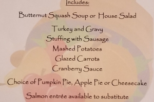 Roast Turkey with Gravy, Maple Baked Ham, Old Fashioned Stuffing, Mashed Potatoes, Sweet Corn, Glazed Carrots, Green Bean Casserole ,Apple Pie, Pumpkin Pie and More!!