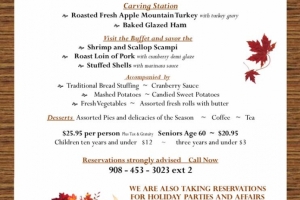 Enjoy a traditional Thanksgiving Feast at Apple Mountain Golf. Bring your family and friends. Tickets are $25 for Adults, Children 12 & under are $12 and Seniors 60 and older are $20.95. Reservations are strongly recommended, so, please call 908-453-3023 extension 2 now!