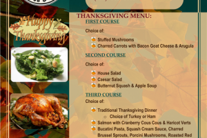 The buffet will include: roast turkey with gravy, maple baked ham, old fashioned stuffing, mashed potatoes, sweet corn, glazed carrots, green bean casserole, apple pie, pumpkin pie and more!