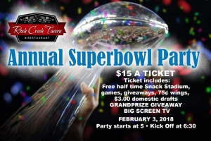 Join Rock Creek Tavern for their Annual Superbowl Party! Tickets are $15 per person which includes a free half time snack stadium, 75 cent wings, $3 domestic drafts, and a grand prize giveaway for a big screen TV. Don't miss out on all the fun. Call 908-777-3777 and get your ticket now.