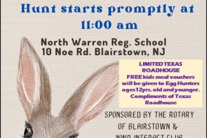 Bring your basket to North Warren Reg. School for an Easter egg hunt and photos with the Easter Bunny. There will be a hunt for kids 5 and under and a seperate hunt for 6 and older. Cash prizes for all the eggs found and handed in!