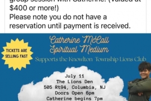 Catherine McCall is coming to Knowlton Lions Club. Bring yourself and your friends. It's BYOB with hot dogs and other snacks for sale. Giving away one free sheet of 25 tricky tray tickets upon entry.
