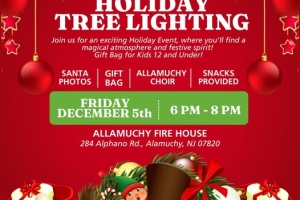 Santa's Coming to Town! The countdown to Christmas begins in Allamuchy this Friday. Bring your family to the Holiday Tree Lighting and meet Santa himself for photos and smiles! Gift bags for kids 12 and under will be available, music by the Allamuchy Choir and complimentary snacks provided.