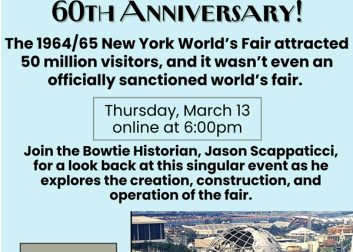 Fondly remembered today by many who grew up in the tri-state area, the 1964/65 New York World’s Fair attracted 50 million visitors, and it wasn’t even an officially sanctioned world’s fair. This lecture by Jason Scappaticci will explore the creation, construction, and operation of the fair. The most popular attractions will also be highlighted using original photographs.