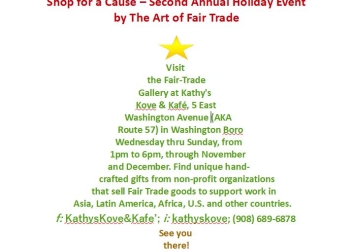 Kathy's Kove invites everyone to shop for the holiday season at their annual Fair Trade market featuring with fine hand-made gifts that proceeds support Asia, Africa, Latin America, the US and other countries. Their event starts November 5 with an Open House November 12 and runs through the month of December.