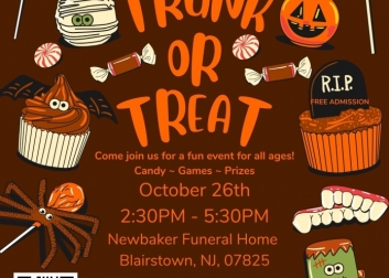 Come out to Newbaker's 4th annual Trunk or Treat celebration! Free admission, costume contest, trunk contest, games and music! If you'd like to be a decorated trunk, there are still spaces available.