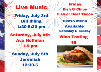 Come out and celebrate your patriotism with a glass of your favorite red, white, or blueberry wine! Live music, food, and fun all weekend long: Bill Ihling Friday, 1:30-5:30pm; Ava Hoffman Saturday, 1-5pm and Jeremiah Sunday, 12:30-5pm.