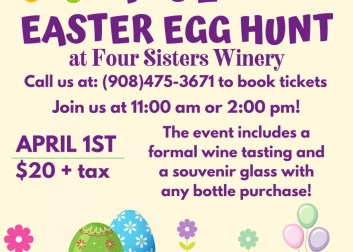 Join Four Sisters Winery for some adult Easter fun with a non competitive hunt! Enjoy a formal wine tasting, a tour, a chance to win tickets to a barefoot grape stomping or murder mystery along with other prizes, and a souvenir glass with any bottle purchase!