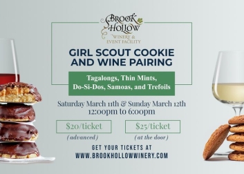 If you are looking for a truly one-of-a-kind, nostalgic, pairing, look no further than Brook Hollow and enjoy the unique flight board with five fan favorite Brook Hollow wines and pairs them with five of the most popular Girl Scout Cookies (Tagalongs, Thin Mints, Do-Si-Dos, Samoas,and Trefoils).