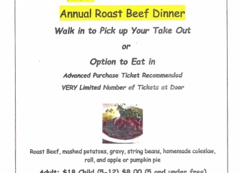 Belvidere UMC is offering a roast beef dinner complete with mashed potatoes, gravy, string beans, homemade coleslaw, roll and apple or pumpkin pie. Take out or Eat In.