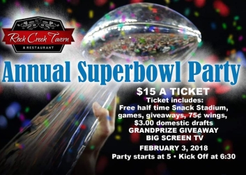 Join Rock Creek Tavern for their Annual Superbowl Party! Tickets are $15 per person which includes a free half time snack stadium, 75 cent wings, $3 domestic drafts, and a grand prize giveaway for a big screen TV. Don't miss out on all the fun. Call 908-777-3777 and get your ticket now.