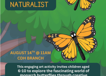The workshop will incorporate educational elements about the importance of monarchs and their role in pollination, while children create their own color pencil garden to create a setting for their painted Monarchs. This hands-on activity fosters creativity, environmental awareness, and an appreciation for one of nature's most iconic species. Space is limited. Please register all children participating.
