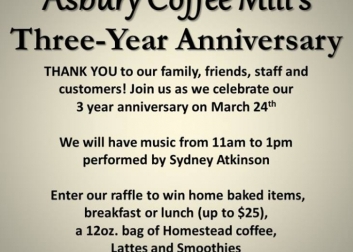 Asbury Coffee is celebrating their 3 year anniversary and wants you to celebrate with them! Music performed by Sydney Atkinson. Enter a raffle to win a prize!