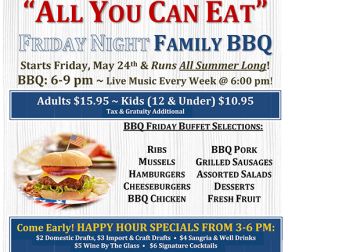 Kick off your weekend each Friday with an "All You Can Eat" Friday Family BBQ! Enjoy live music, delicious summer eats and BBQ, ice-cold cocktails & beverages, all while enjoying our gorgeous panoramic golf course scenic views. Come on out for a great community, neighborhood event from 6-9pm. Live music begins at 6pm; come early for Happy Hour specials from 3-6pm. Make your reservation today.