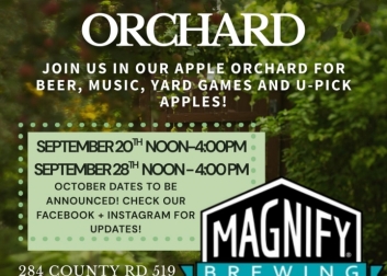Mackey's Orchard presents a weekend in the beer garden, featuring Magnify Brewing. Live music, apple picking, food truck and yard games will also be available. Must be 21+ to enter.