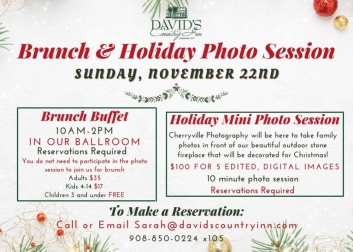 Make reservations (required) for brunch, with the option of a 10-minute holiday photo session in front of the beautiful outdoor stone fireplace! Call 908-850-0224 x105.