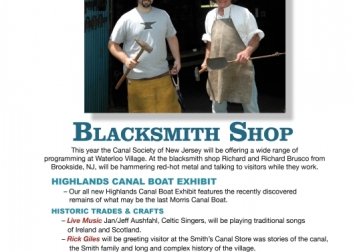 The Canal Society of New Jersey offers a wide range of programming at Waterloo Village. At the Blacksmith Shop, Richard and Richard Brusco (father and son) from Brookside, NJ, will be hammering red-hot metal and talking to visitors while they work.