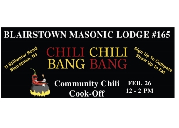 Do you have a great chili reciepe or do you like to eat chili? Blairstown Masonic Lodge is hosting their Chili Chili Bang Bang cook-off. Sign up to enter your best reciepe or come out to test taste.