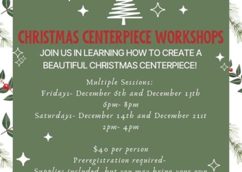 Your perfect holiday table decoration! Create a beautiful Christmas centerpiece using fresh greens and seasonal decor in this festive, hands-on workshop! Whether you're new to centerpiece-making or a seasoned pro, this fun, relaxing event will leave you with a stunning accent for your holiday table. $40/person (supplies included), preregistration required. You may bring your own beverage/snacks if you like.