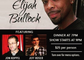 Looking for a night packed with good times and laughter? Limited seats, so get your tickets now! $25 includes dinner and the show. Three great comedians: Elijah Bullock, Jon Koppel and Jeff Roser. Call 908-777-3777 for tickets. Dinner starts at 7pm followed by the 9pm show.