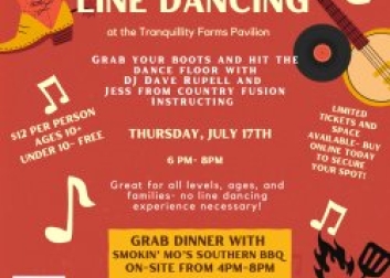 Grab your boots and hit the dance floor with DJ Dave Rupell and Jess of Country Fusion Instructing! Great for all levels, ages, and families - no line dancing experience necessary! $12/person ages 10+ (children younger than 10 are free). LIMITED TICKETS AVAILABLE to ensure dancing space in the pavilion! Tickets available online or at the door (if not sold out prior).