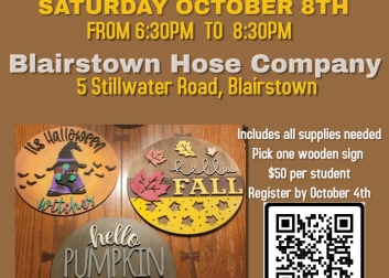 Make a cute Halloween or Fall sign at the Blairstown Hose Co. for their Fall fundraiser. This DIY class will be led by Bright Light Creations will allow you to choose one of three different designs and all supplies are included.
