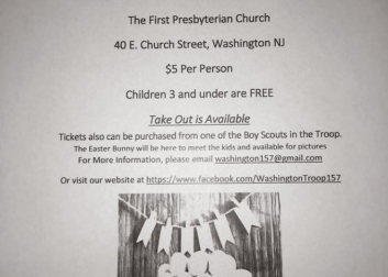Support Boy Scout Troop 157 at the First Presbyterian Church by having breakfast with the Easter Bunny! They will have eggs, pancakes and sausage. Takeout is available as well. While you are there, get your picture taken with the Easter bunny. Tickets are available at the door for $5 and kids 3 and under are free.