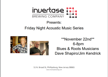 Invertase Brewing Company will be hosting the duo of Dave Shapiro (guitar) and Jim Kendrick (mandolin) for an evening of Blues & Roots! The tap room will be open for pours and growler fills from 4-9pm. BYO food or order in for delivery. Make plans to join us for good beer, good tunes, and good fun!