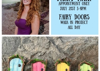 Our local fairy is flying by again and adding sparkle and shine again this month! Book your appointment with Kelly for your own fairy hair! She has several colors to choose from and teaches you how to care for your new glittery goodness. While you wait, create your own fairy doors!