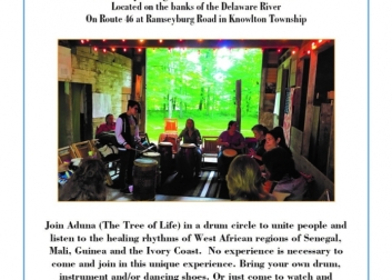 Knowlton Township Historic Commission hosts drum group Aduna (The Tree of Life) to lead a drum circle to unite people and listen to the healing rhythms of West African regions of Senegal, Mali, Guinea and the Ivory Coast.