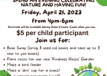 Enjoy an Earth Day themed activity night with the kids! There will be hosting a book swap, painting rocks for a 'Kindness Rocks Garden', running a scavenger hunt, making a bird feeder (nut-free), and the kids can cool off by making a pudding dirt cup!