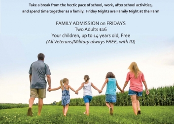 Take a break from the hectic pace of school, work, after school activities, and spend time together as a family. Friday Nights are Family Night at the Farm, with special family admission prices for the military-themed corn maze. Two adults $16 and your children, up to 14 years old, are admitted free. (All Veterans/Military always FREE, with ID.)