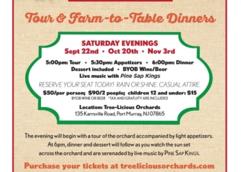 Come out and enjoy a delicious meal made from fresh ingredients in a beautiful setting. Hosted and prepared by the farm owners, the Kesler Family, this three-course meal features fresh fruits and vegetables from TreeLicious’s own fields. The evening begins at 5pm with a walking tour of the farm and appetizers, and continues with dinner and dessert at 6:30pm, accompanied by live music and refreshments. Bring your own wine or beer.