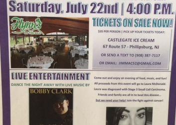 Fundraiser for Laura McDonald. Food, drinks, music (Bobby Clark Band), quoit tournament, Tricky Tray, 50/50 drawings! $35/person. For tickets: Castlegate Ice Cream, 67 Route 57, Phillipsburg
