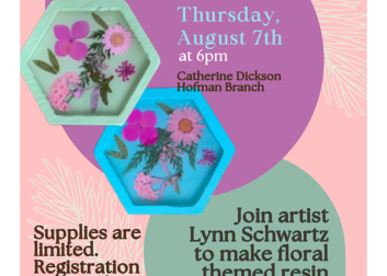 Come out to CDH for a class making floral resin coasters led by artist Lynn Schwartz. For teens and adults aged 16 and up. Space is limited and registration is required.