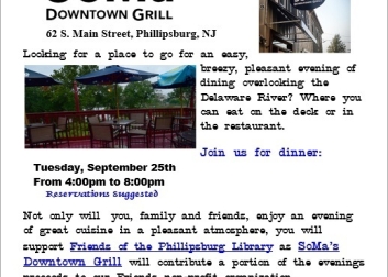 The Friends of the Phillipsburg Free Public Library cordially invite you, family and friends to attend its 3rd Dine-Out Fundraiser at SoMa Downtown Grill, where you can enjoy the evening with a good meal while sitting on the patio deck overlooking the Delaware River, or inside the restaurant. Either way, the proceeds from your patronage will benefit the Phillipsburg Free Public Library as SoMa will donate a percentage of the evenings receipts to the Friends. Reservations are suggested. Please bring a copy of the flyer, either in hard copy or on tablet or phone.