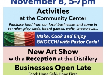 The Hope Creative Team encourages you spend the evening in the village shopping, supporting local eateries, playing games, taking in an Art Show, and helping celebrate the 70th anniversary of the Hope Historical Society! Join friends an neighbors doing any/all of these things, and help plan the next Fun Friday!