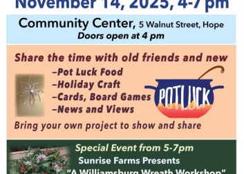 This is the last Fun Friday of the year, so come out and enjoy the sights and sounds of Hope. The Hope Creative Team encourages you spend the evening in the village shopping, supporting local eateries, playing games, and socializing! The Community Center will have pot luck food, holiday crafts, cards, board games, news and more.