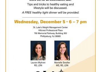 Advance registration is required for this informative talk on eating healthy over the holidays. A FREE light healthy dinner will be provided. Call 1-866-STLUKES (785-8537) Option 4. Presentedy by Lauren Myhren, RD, LDN and Marielle Smoller, MS, RD, LDN.