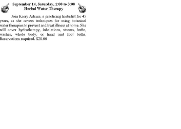 Join Kerry Adams, a practicing herbalist for 45 years, as she covers techniques for using botanical water therapies to prevent and treat illness at home. She will cover hydrotherapy, inhalations, steams, baths, washes, whole body, or hand and foot baths. Learn more about Kerry here. Reservations are required. Cost is $28.