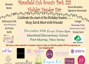 Mansfield Cub Scout Pack 222 hosts its 3rd annual Holiday Vendor Fair! Come on out and do some early holiday shopping from a wide variety of vendors ready to help you find the perfect gift for everyone on your list.