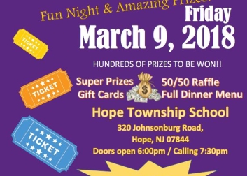 Come on out to the Hope Twp PTA & Project Graduation Tricky Tray to possibly with some amazing baskets, super prizes, gift cards and 50/50. Full dinner menu available to purchase. All proceeds benefit the school, with a portion going to Project Graduation, which gives our 8th graders the wonderful experience of traveling to our nations’s capital, Washington D.C. Doors open at 6pm.