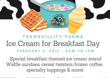 Join Tranquillity Farms in celebrating National Ice Cream for Breakfast Day! Check out the menu of delicious sundaes, twisters and shakes. All items will be served to go and weather permitting we have outdoor seating available and will have fire pits! Check out the discussion area on the Facebook event page for full menu and pictures! *Please remember masks are required when ordering and in our farm market. Please maintain social distancing*