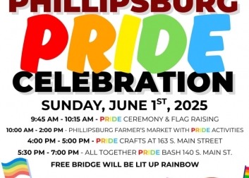 First Phillipsburg PRIDE Celebration! PRIDE Flag Raising at Shappell Park, 9:45-10:15am; PRIDE Activities at the Phillipsburg Farmers Market, 10am-2pm; PRIDE Crafts at 163 S. Main St, 4-5 pm; PRIDE Bash at 140 S. Main St, 5:30-7pm and the Free Bridge will be lit up in rainbow colors.