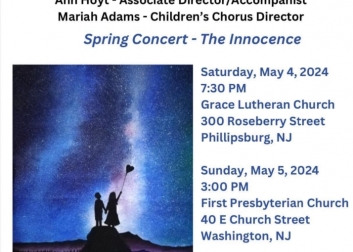 Featuring the Children's Chorus of Warren County comes the "The Innocence," Warren County Community Singers Spring Concert. Directed by Hunter Chadeayne and Mariah Adams, there are two chances to see the performance, Saturday, May 4 at Grace Lutheran Church in Phillipsburg and Sunday, May 5 at the First Presbyterian Church of Washington.