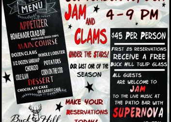 Last one of the Season!  The first 25 reservations receive a FREE Buck Hill tulip glass. Jam with SUPERNOVA at the Patio Bar starting at 8pm. $45/person for a special menu featuring: homemade crab dip with buck chips, dozen clams, whole lobster and half -dozen Shrimp, potatoes, chorizo, cole slaw, corn on the cob; and chocolate cake or carrot cake for dessert.
