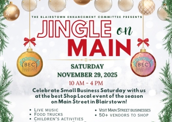 Jingle on Main is a festive Small Business Saturday event featuring over 50 local vendors, food and music, presented by the Blairstown Enhancement Committee and held throughout Blairstown's Historic Main Street.