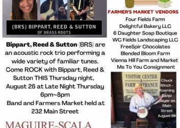 Restaurant, brewery and retail specials throughout town, plus a Farmers Market and live music. This final Late Night Thursday of the season features Bippart, Reed and Sutton (acoustic rock trio), and roaming banjo player, Chuck Winch. Music and market are at 232 Main Street.